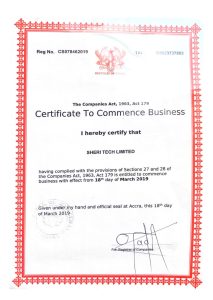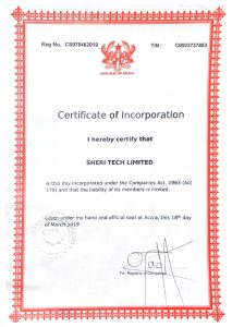 SHERI-TECH is incorporated with a Certificate to Commence Business as a private company limited by shares under the Companies Act, 2019 (Act 299) of the Republic of Ghana. The company is duly registered with all required statutory and regulatory bodies including the Public Procurement Authority as a requirement to engage in government tenders as mandated by Section 3(p) of the Public Procurement Act, 2003, (Act 663) as amended